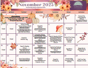 You can download a printable copy of our monthly Events Calendars, which includes descriptions of the programs.